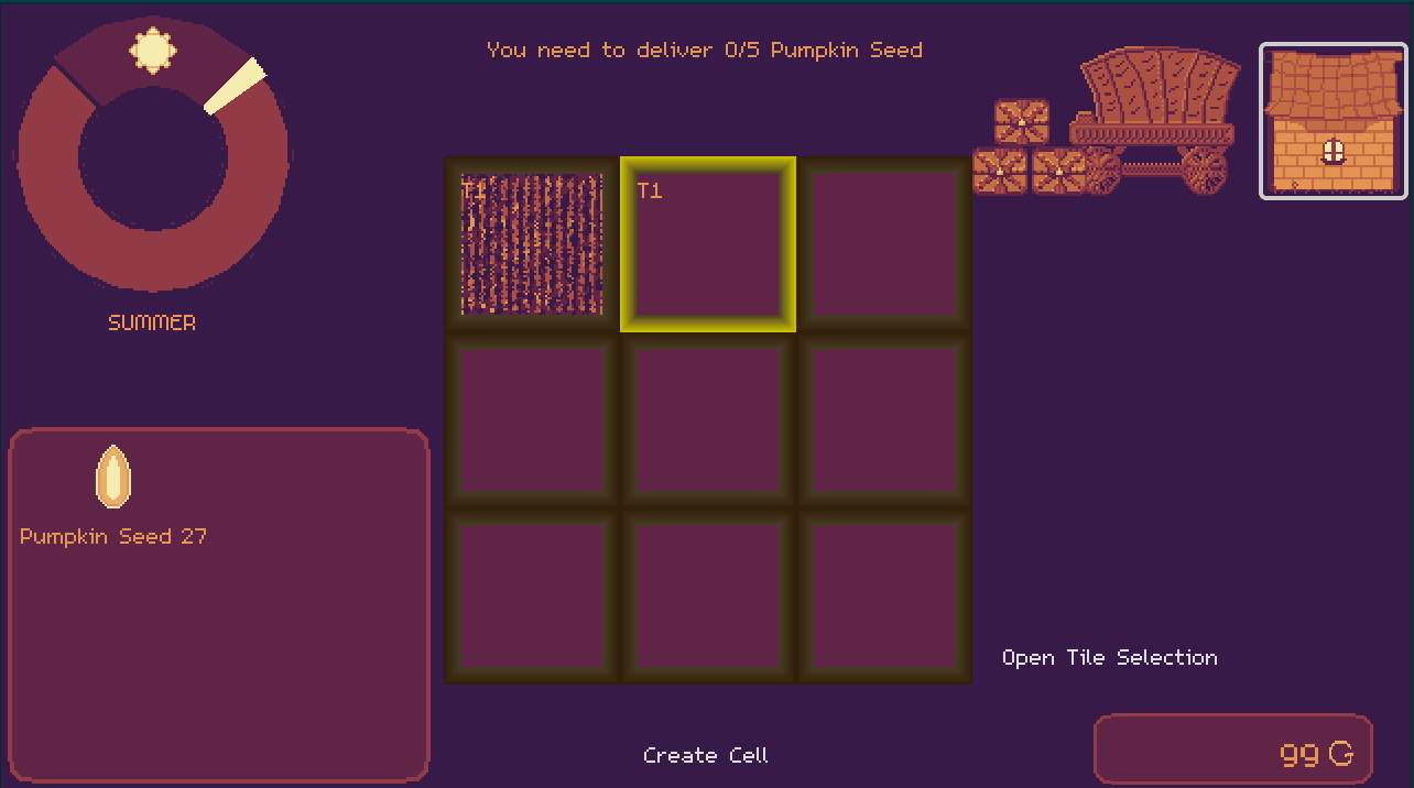 Following a fall theme and restricted color palette, our simple farming game allows the player to have a relaxing and calming farming experience. All of the above packed into a lovely 3x3 grid.